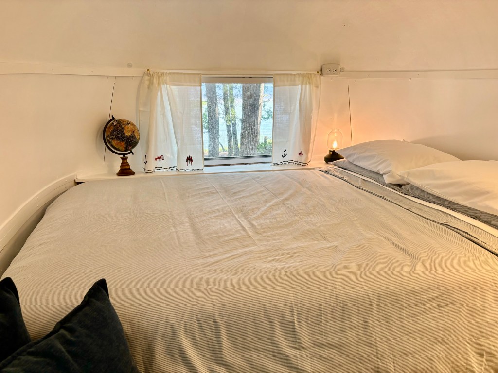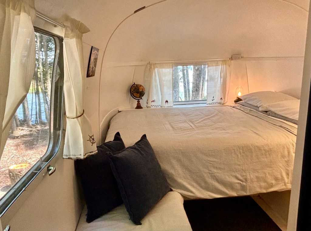 - In the Downeast Airstream we took out the 70’s style twin beds and added a Queen with a hybrid mattress, crisp, clean sheets, and cozy duvet. The sofa in the salon converts to a twin and there is a settee across from the bathroom that is perfect for kids. The Tiny House A-Frame Cabin features a comfortable double bed plus a twin bed. We also have a crib and a Pack and Play available.