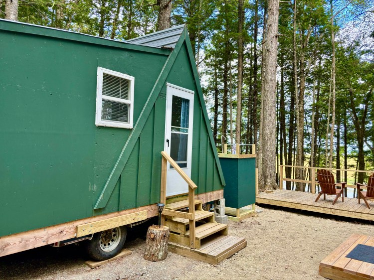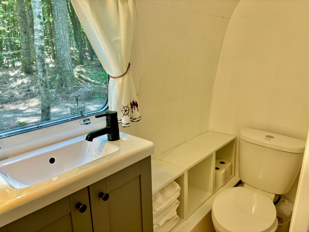 - The Downeast Airstream has a bathroom with hot water and a real flush toilet. And its enclosed (private) outdoor shower that looks out toward the lake is on the Airstream’s private deck. The Tiny House A-Frame’s bathroom has hot water and a flush toilet.