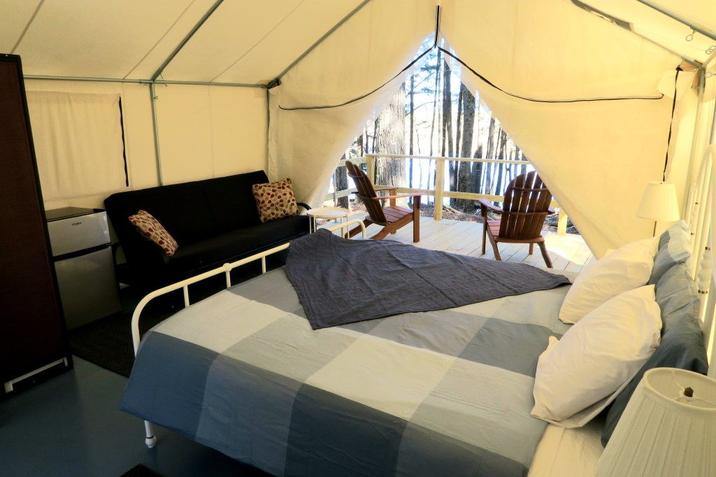 - Each Camp has a mini fridge and a Keurig coffee maker right in the tent so you can enjoy cold drinks in the evening or hot coffee in the morning on the deck without having to leave the tent.